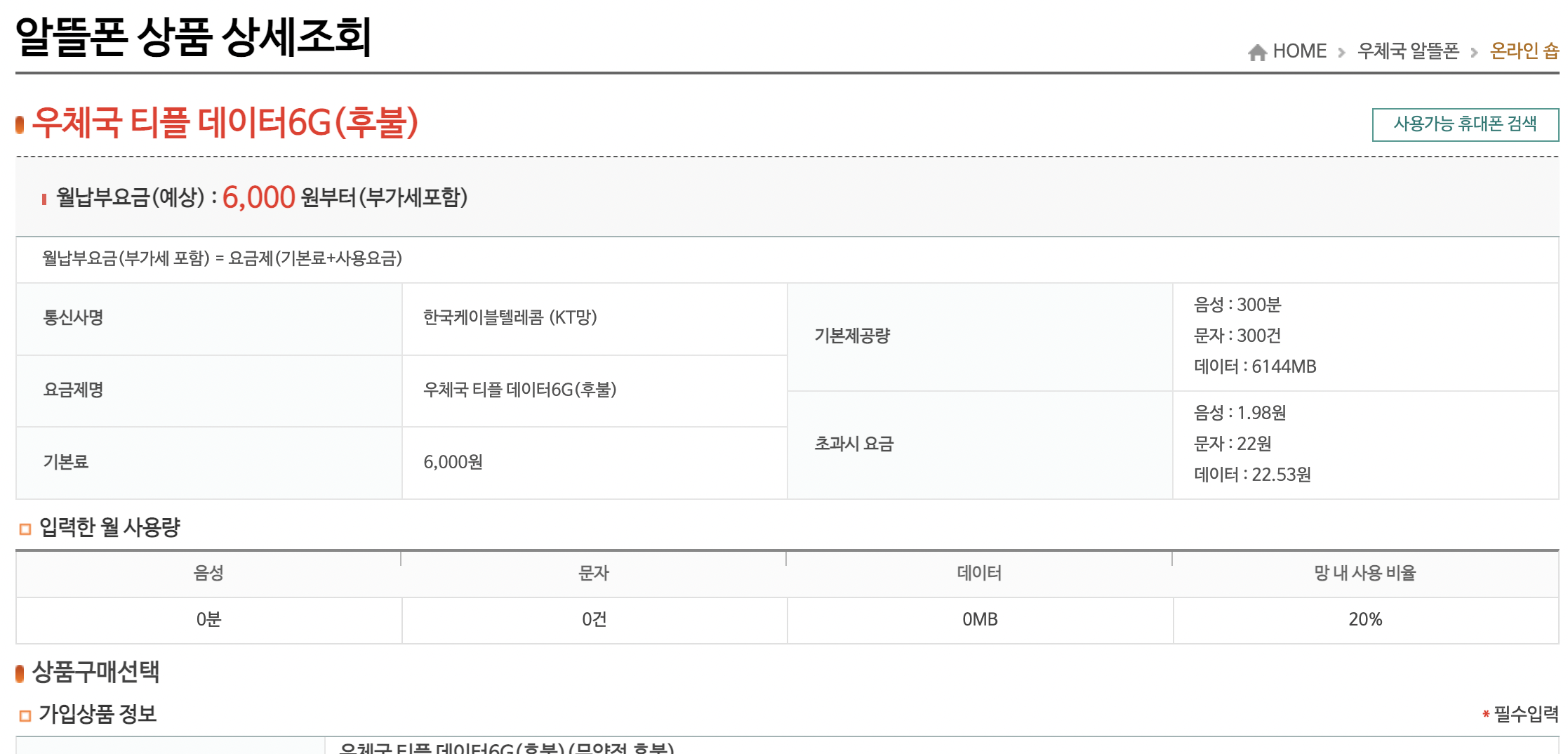 우체국 티플 데이터6G는 6000원에 300분 / 300문자 / 6G 데이터 제공 서비스이다.
